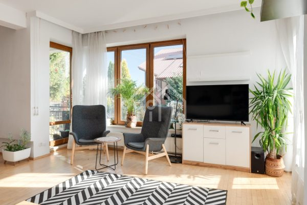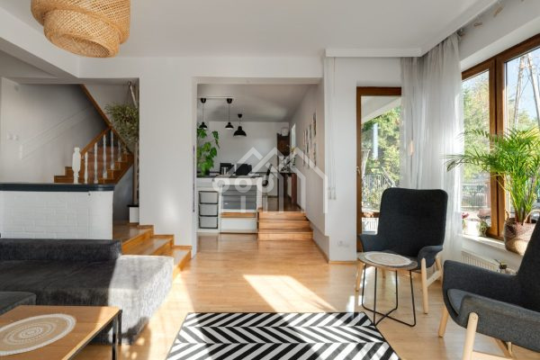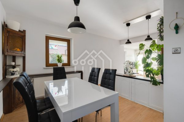Budynek z 1990 roku, usytuowany na działce o powierzchni 491 m². W budynku znajduje się duża, wysoka piwnica z wyjściem na ogród, toaleta oraz kotłownia – możliwość zaaranżowania na działalność gospodarczą. Z dwóch balkonów znajdujących się na piętrze jest widok na dwa jeziora. Salon posiada duże okna, które mocno doświetlają pomieszczenie oraz dwa wyjścia na tarasy. Dodatkowo na posesji znajduje się garaż z kanałem i bramą automatyczną.