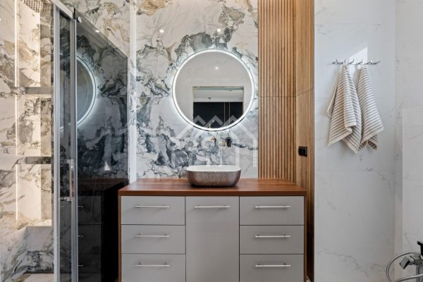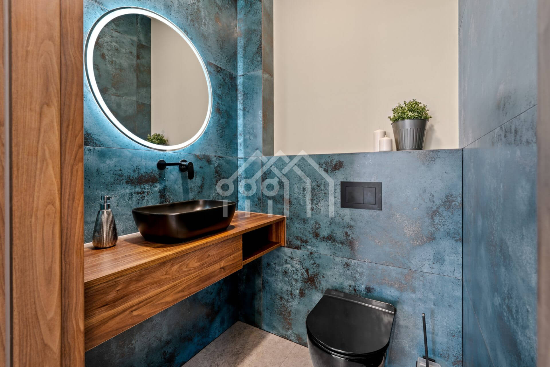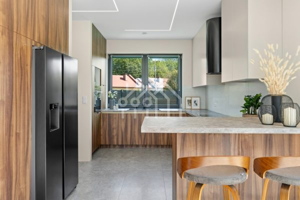 Dom został zaprojektowany z ogromną dbałością o szczegóły i wykończony materiałami najwyższej klasy. W całym budynku zastosowano ogrzewanie podłogowe (także w garażu), rekuperację, a także przygotowano instalacje pod klimatyzację i fotowoltaikę. Dla bezpieczeństwa dom wyposażony jest w nowoczesne systemy alarmowe – zarówno zewnętrzne, jak i wewnętrzne.