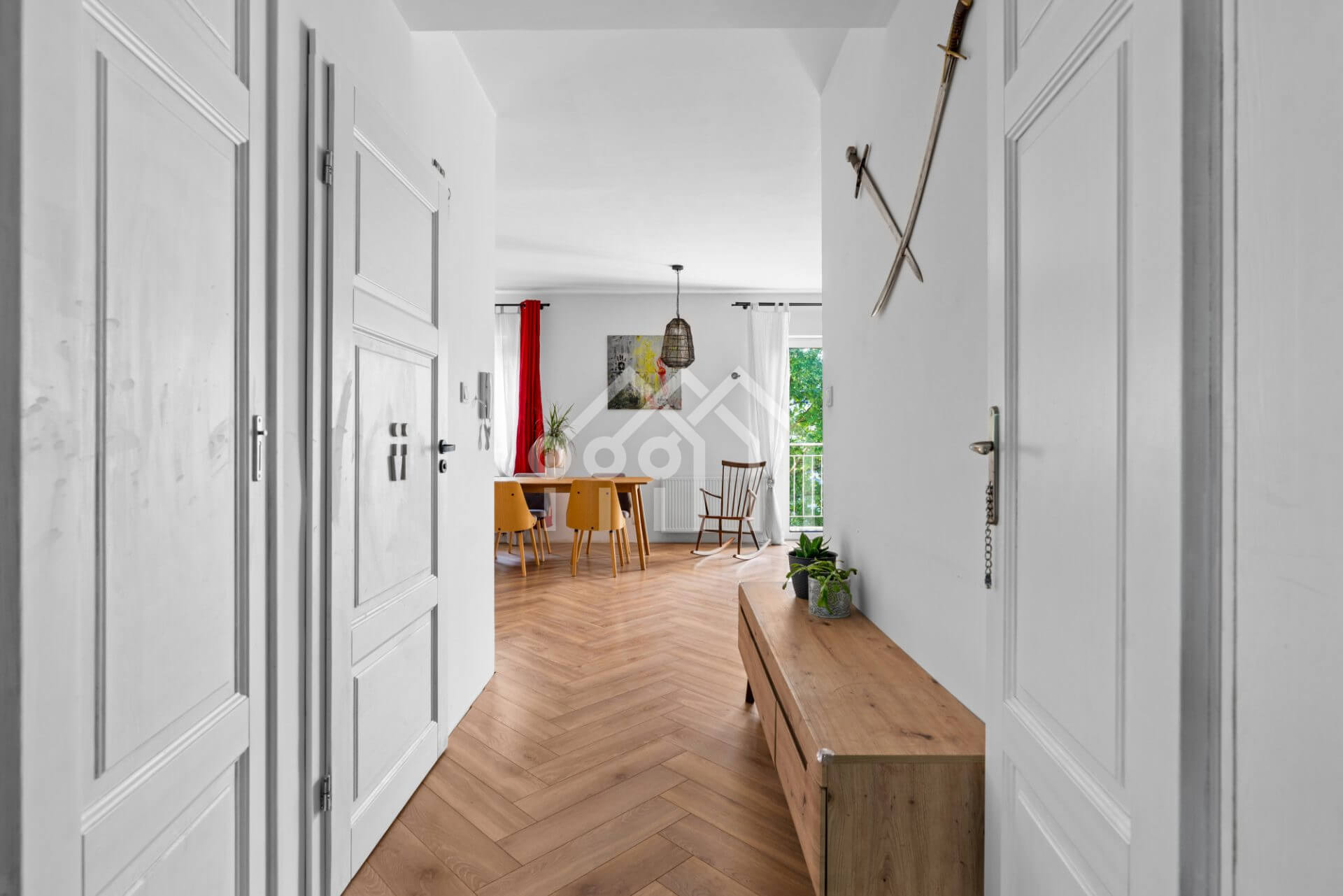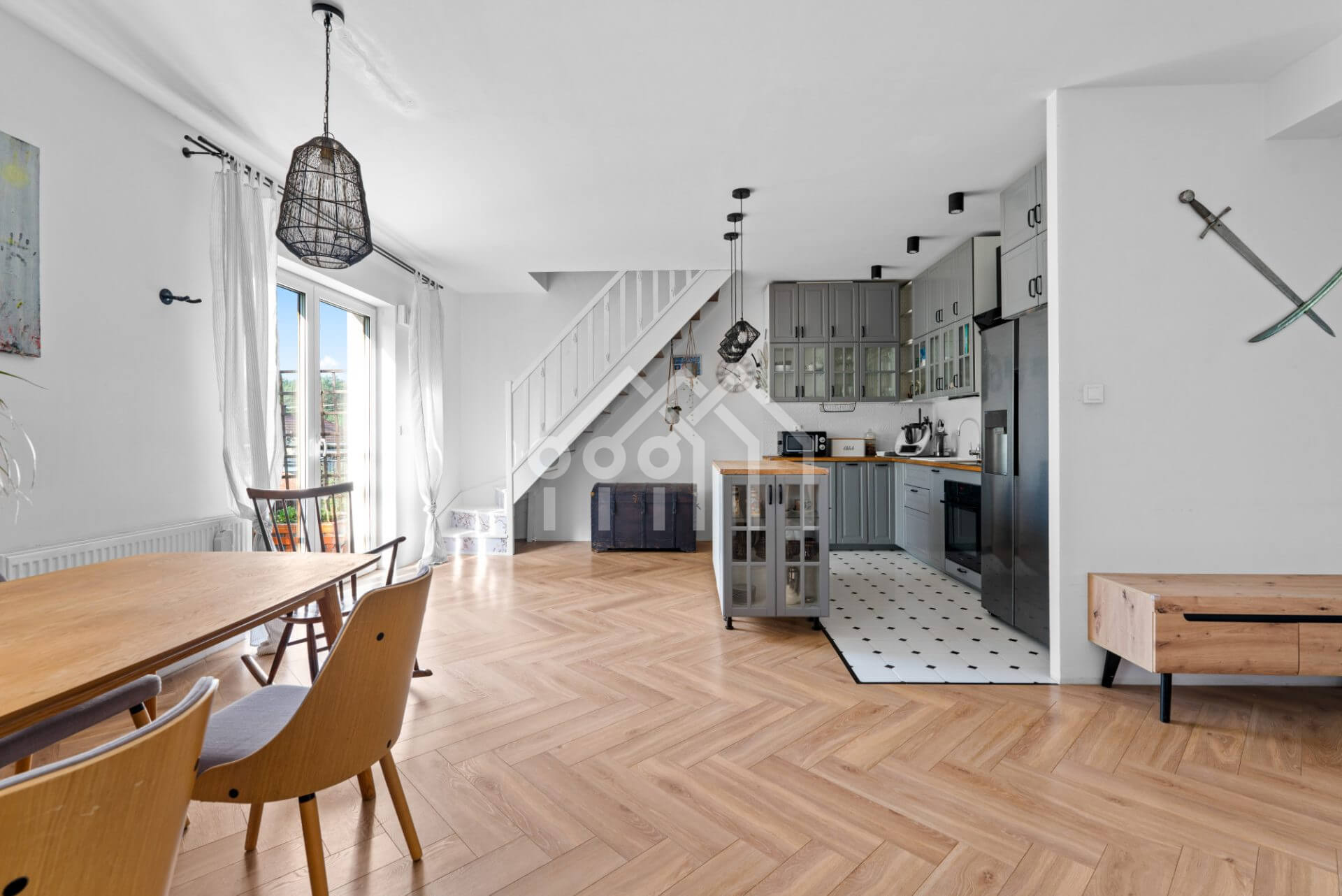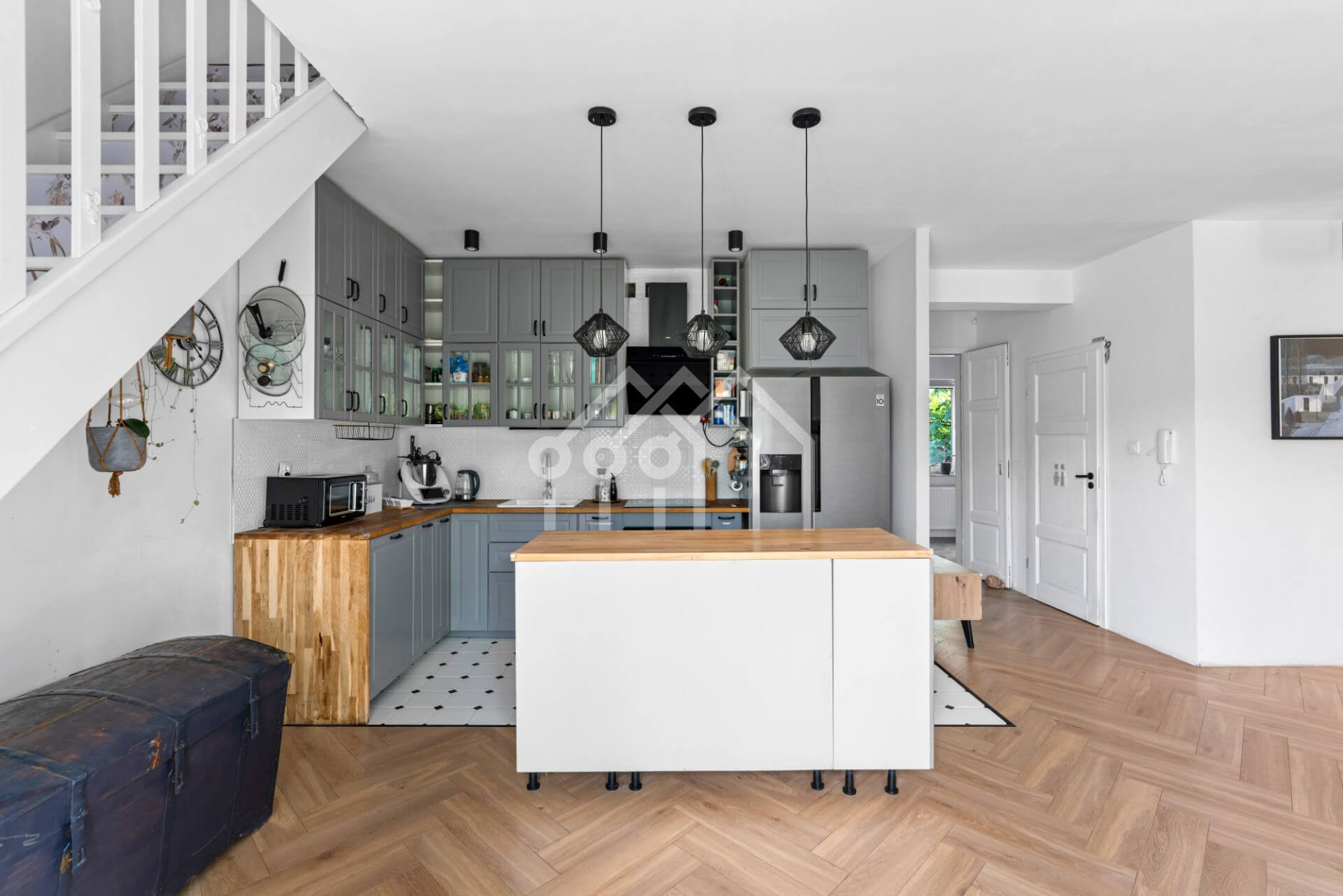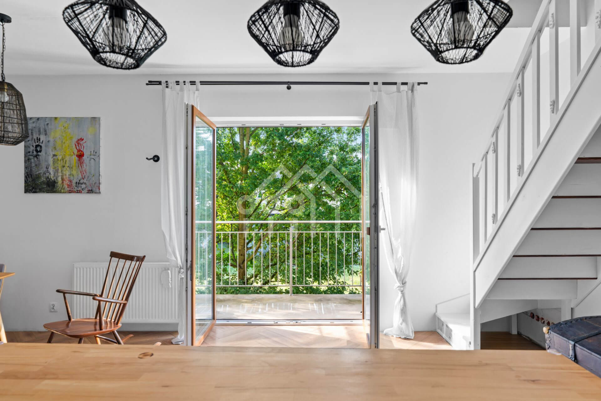 I kondygnacja: przestronny salon z wyjściem na balkon w otoczeniu drzew, połączony z w pełni wyposażoną kuchnią (zmywarka, duża dwudrzwiowa lodówka), a także duża sypialnia z garderobą oraz łazienka z wanną.