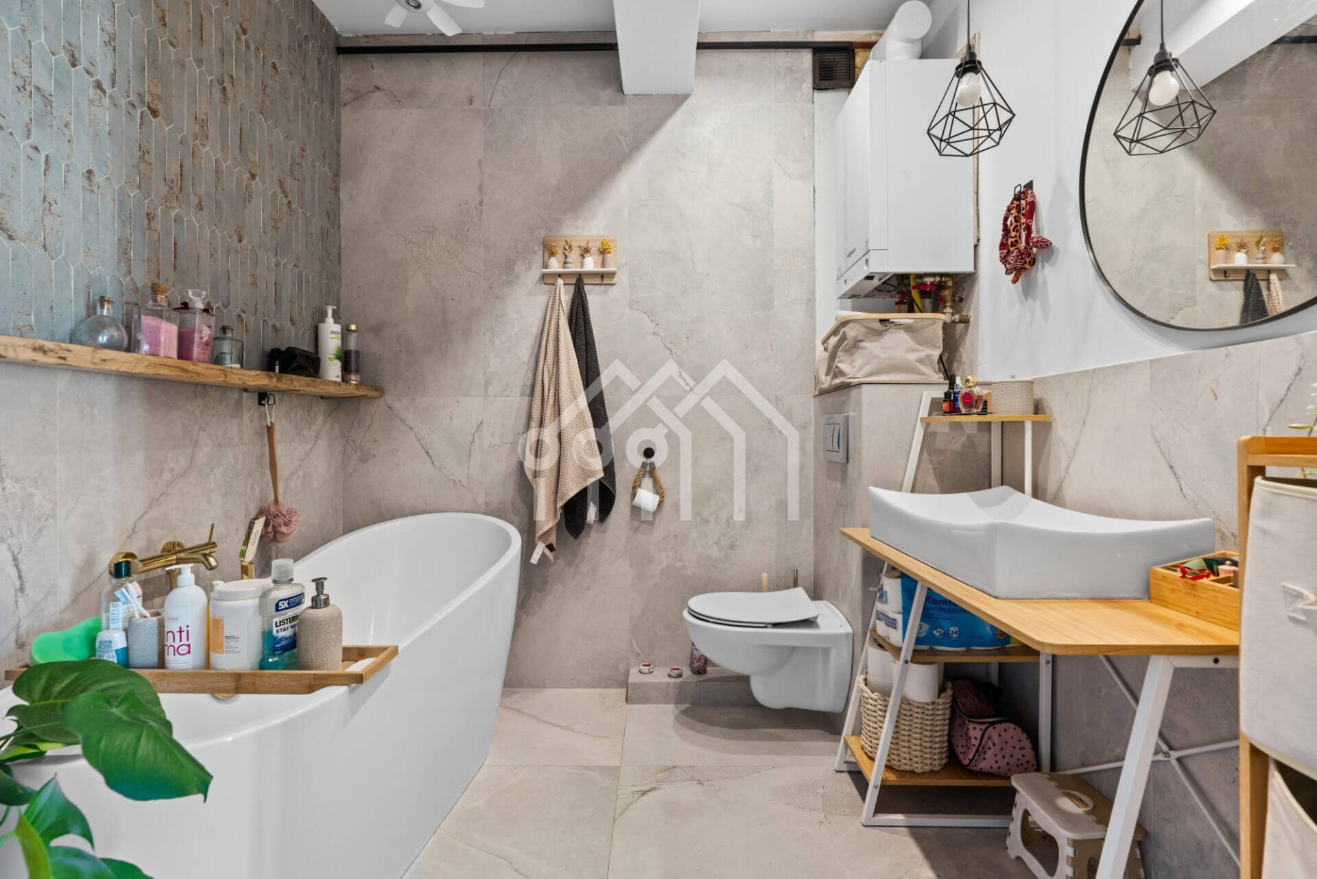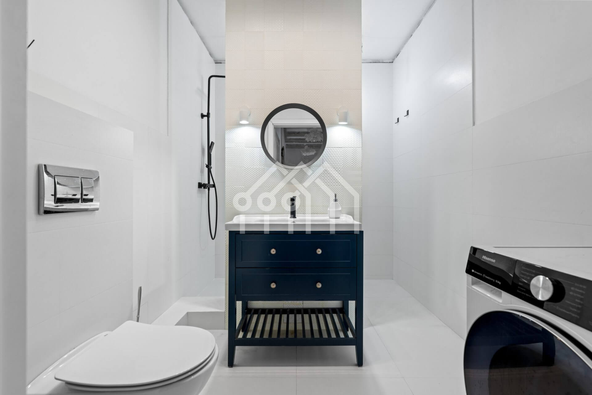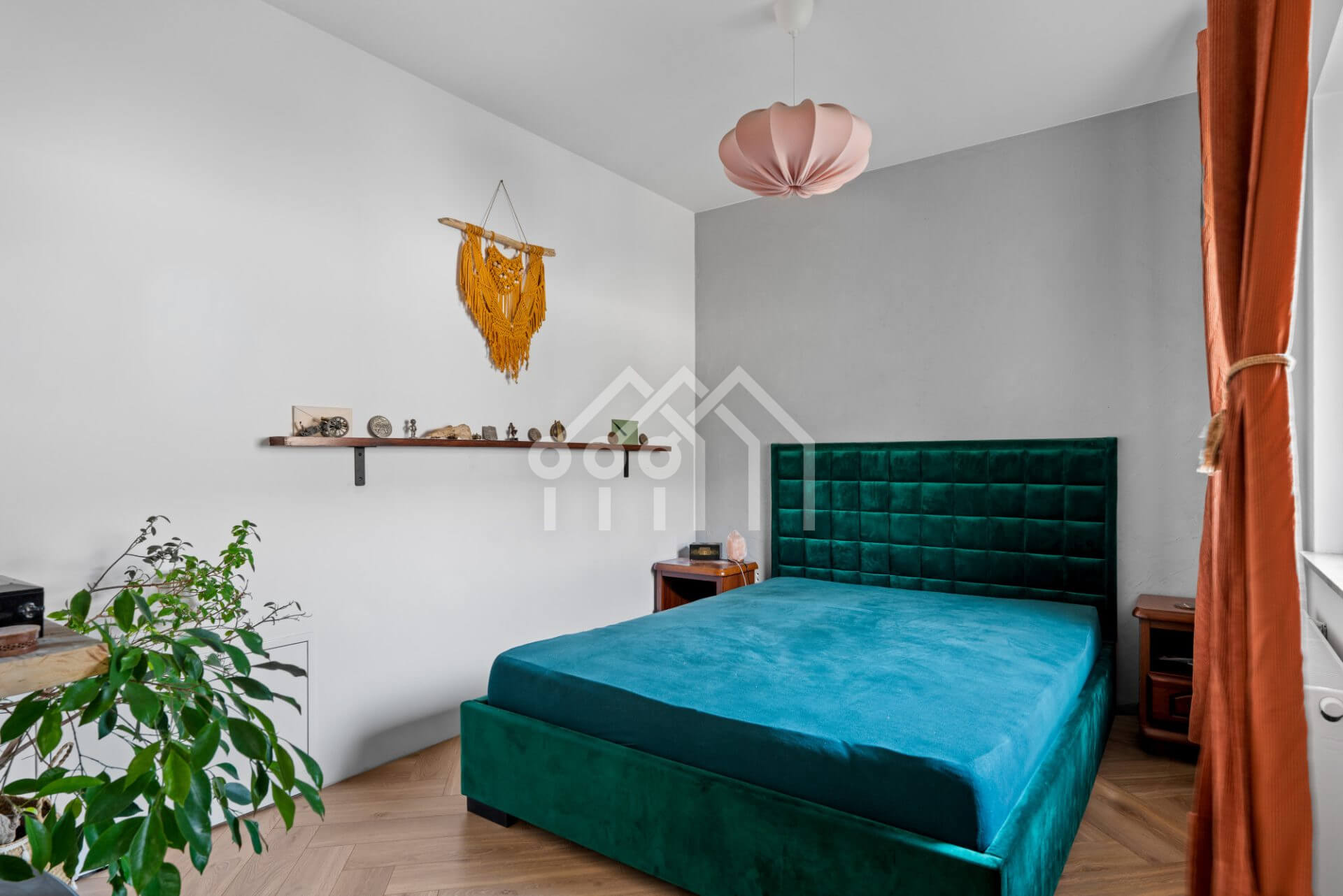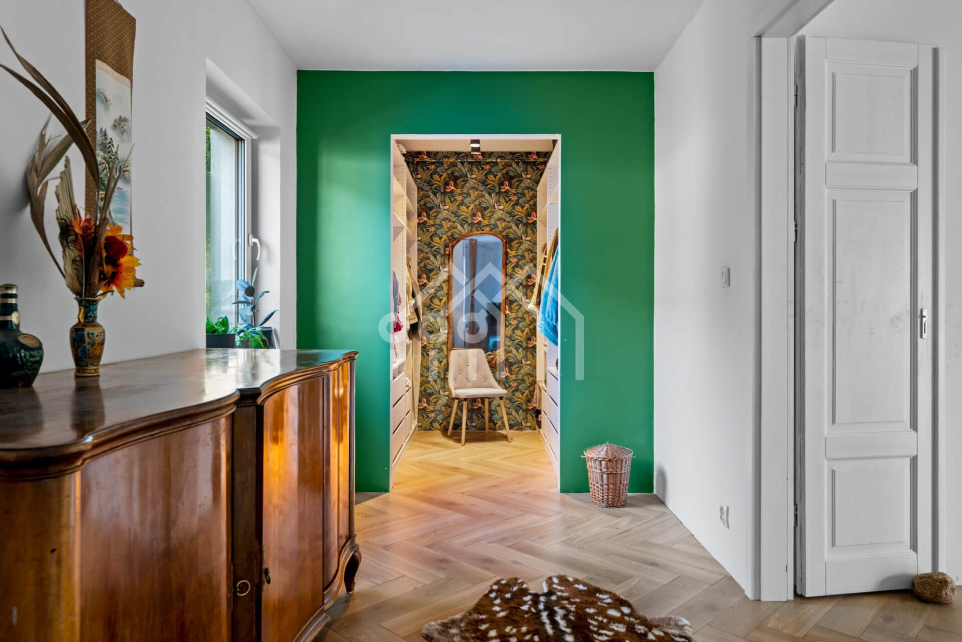 I kondygnacja: przestronny salon z wyjściem na balkon w otoczeniu drzew, połączony z w pełni wyposażoną kuchnią (zmywarka, duża dwudrzwiowa lodówka), a także duża sypialnia z garderobą oraz łazienka z wanną.