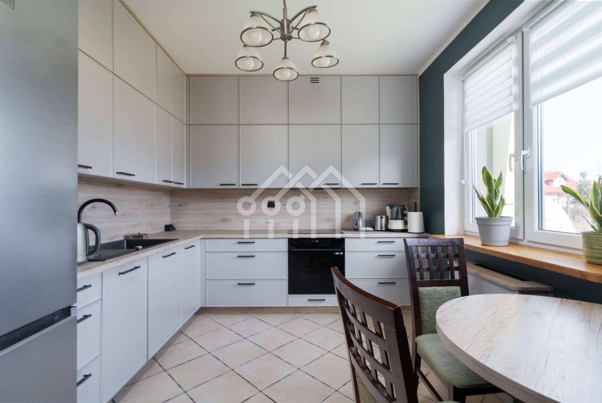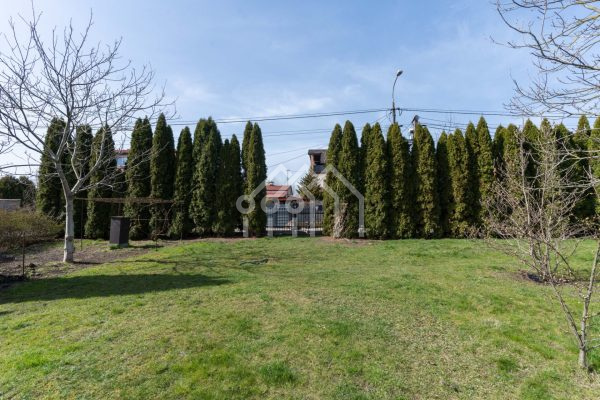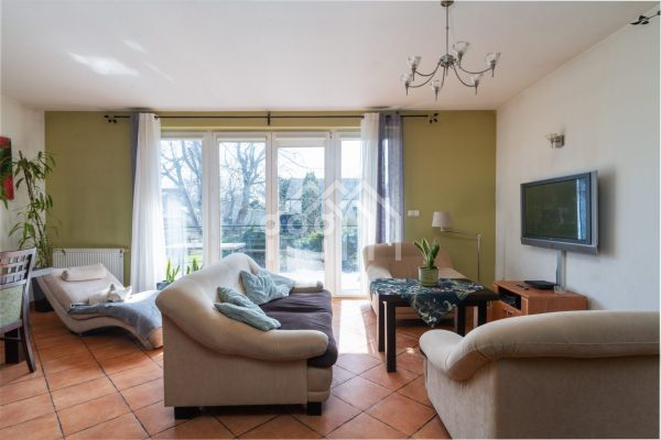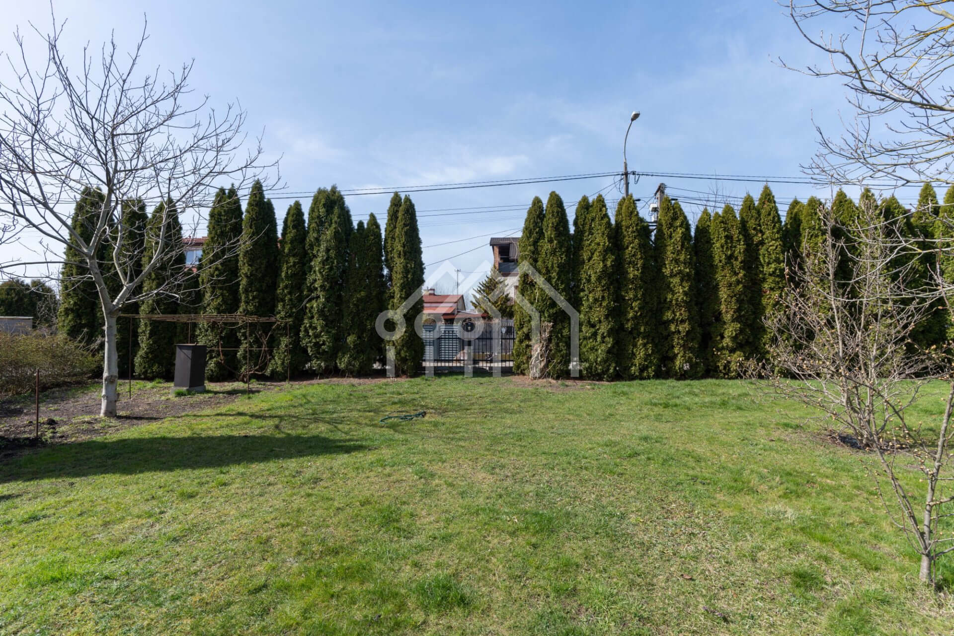 The sunny garden on the south side consists of a carefully maintained lawn, a terrace and a stone barbecue. An additional part of the plot is located in front of the entrance to the premises, where there is a green belt and a driveway for two more cars.