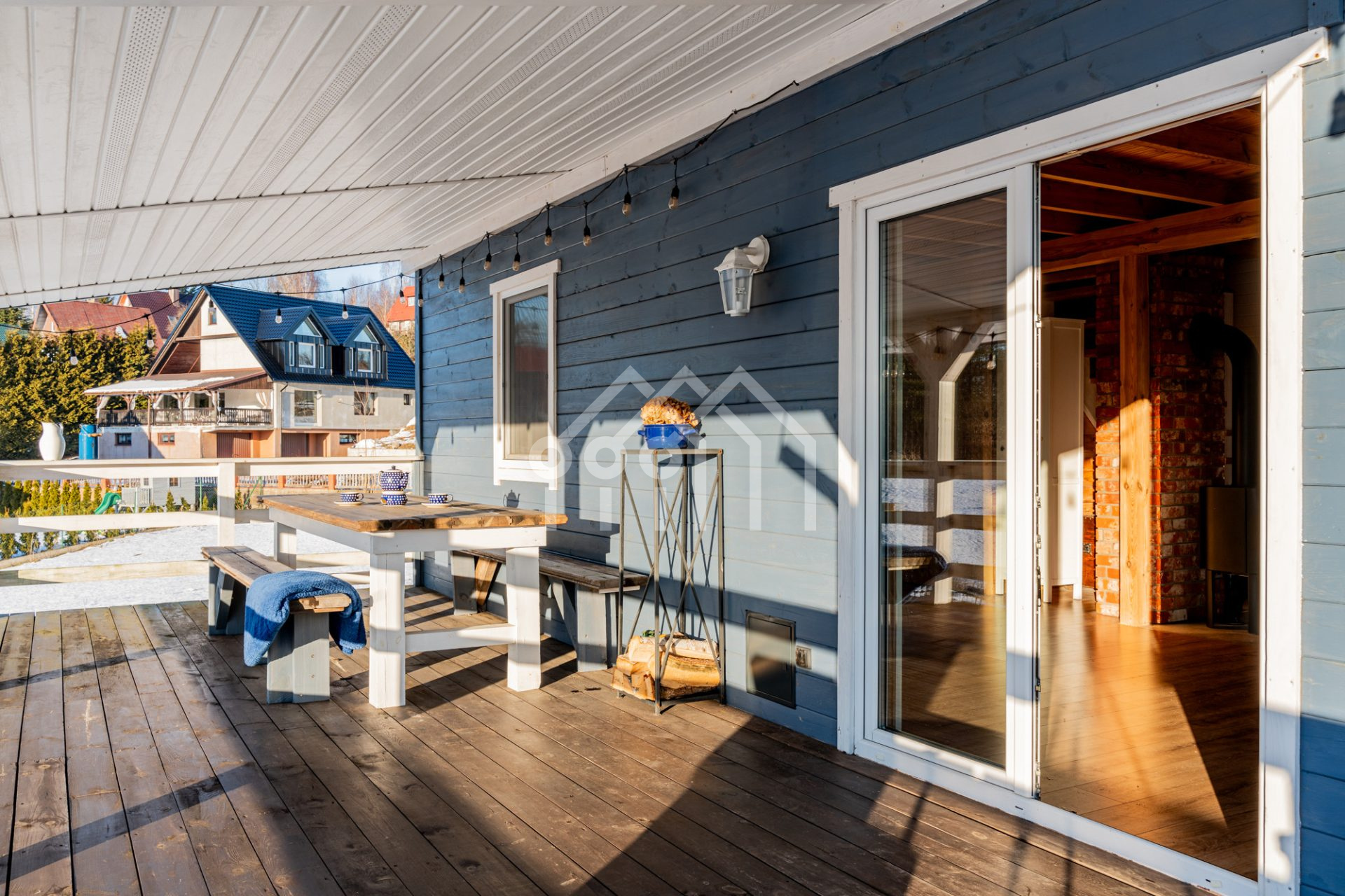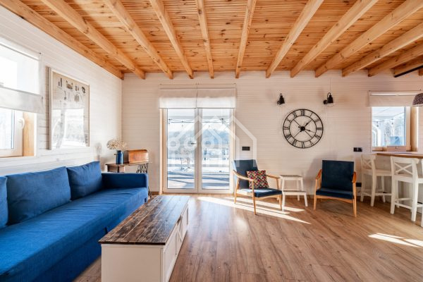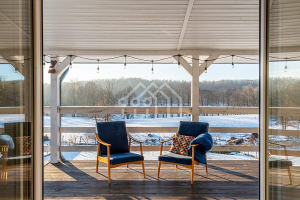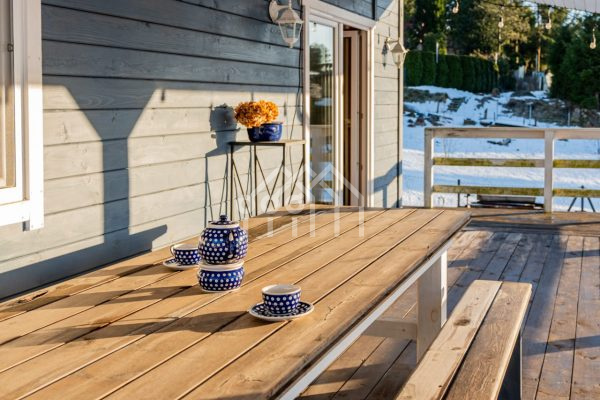 Drewniany dom całoroczny w kolorze niebieskim tworzy niezwykłą harmonię z otoczeniem oraz zaprojektowanym wnętrzem. Niebywałym atutem domu jest przestronny, zadaszony taras boczny o długości ok 8 m i szerokości ok 3 m, który jest doskonałym miejscem do relaksu podczas porannej kawy z widokiem na jezioro, wieczornych spotkań przy lampce wina, czy letnim grillowaniu w gronie bliskich.