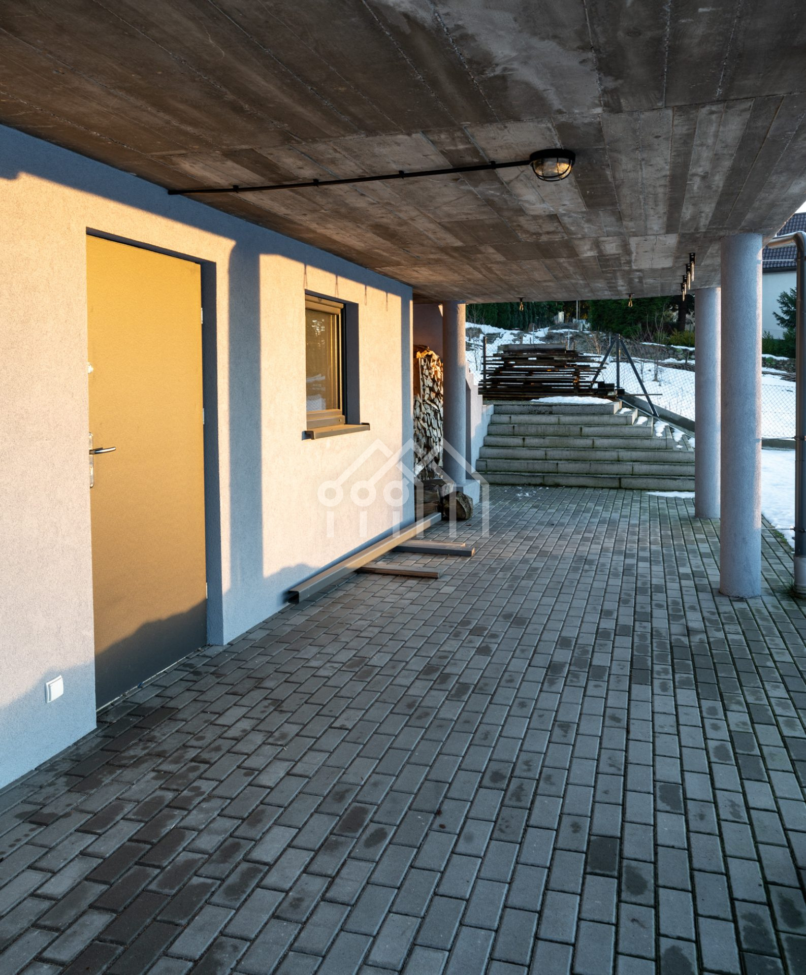 Wjazd na posesję prowadzi przez automatyczną bramę, która zapewnia wygodę i bezpieczeństwo. Podjazd wyłożony jest estetyczną kostką brukową, co daje całości elegancji i podkreśla staranne zagospodarowanie terenu.