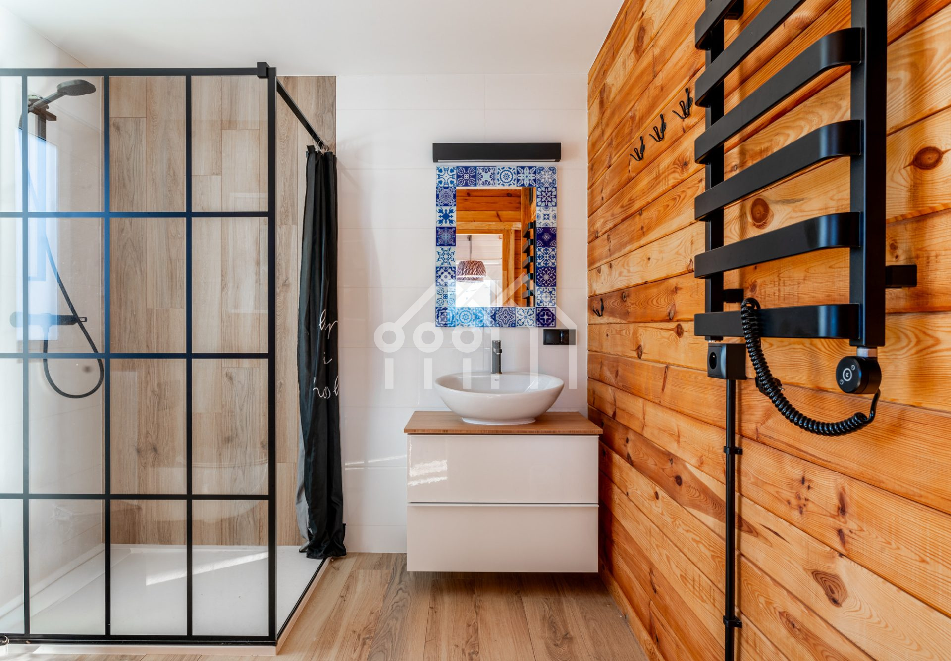 Na parterze znajduje się również pełnowymiarowa łazienka z prysznicem, urządzona w spójnym stylu do całości domu.