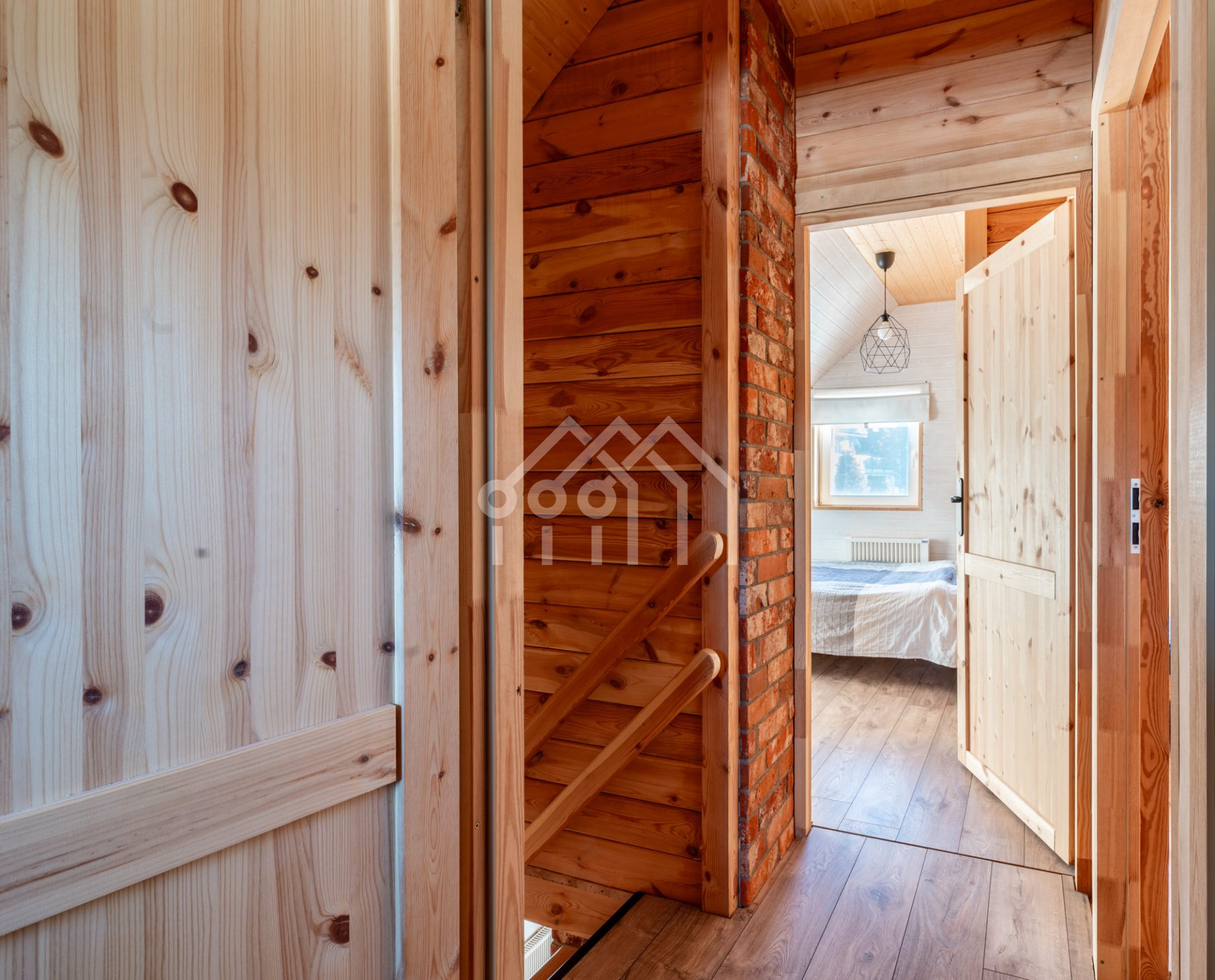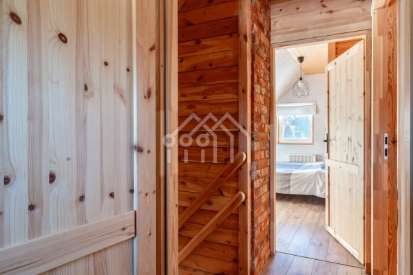 Na piętro prowadzą drewniane schody. Solidne wykonanie oraz klasyczny design sprawiają, że harmonijnie komponują się z wystrojem domu. Schody są wygodne i bezpieczne, a ich naturalna struktura drewna podkreśla przytulny charakter wnętrza.