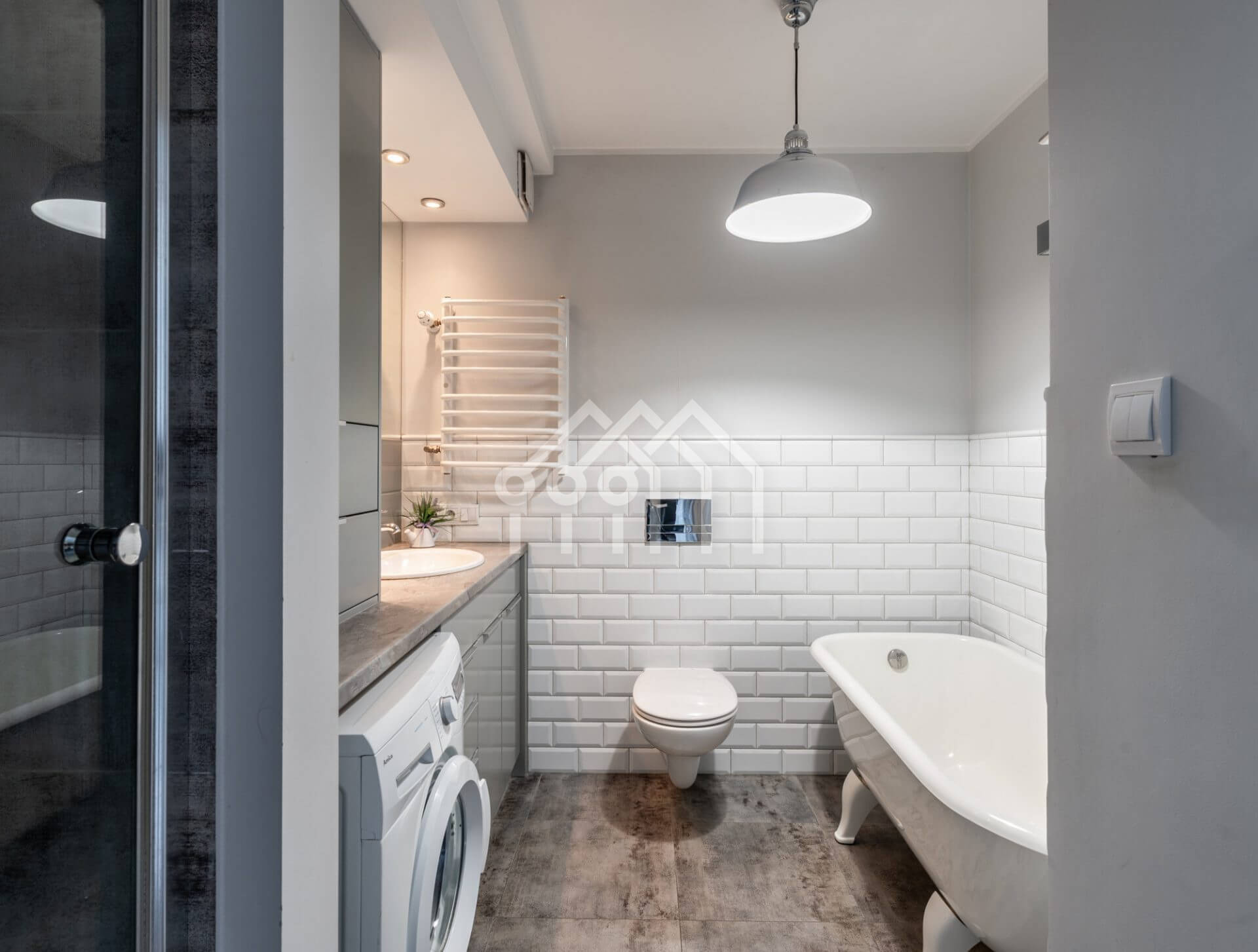 Łazienka, utrzymana w jasnej tonacji, również idealnie komponuje się z całością mieszkania. W tej przestrzeni również nie zabrakło wykonanych na wymiar mebli, umożliwiających przechowywanie niezbędnych akcesoriów, które pozwalają na utrzymanie porządku. Ogromnym atutem łazienki jest wolnostojąca wanna, idealna do relaksujących kąpieli oraz przestronna kabina prysznicowa, dla tych co cenią sobie szybkie i wygodne rozwiązania.