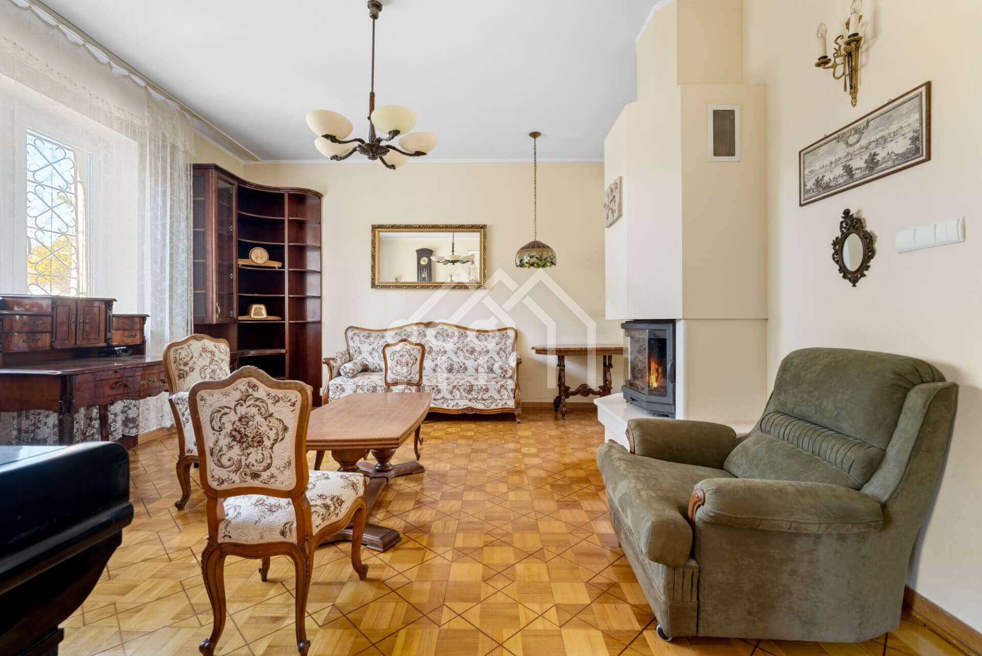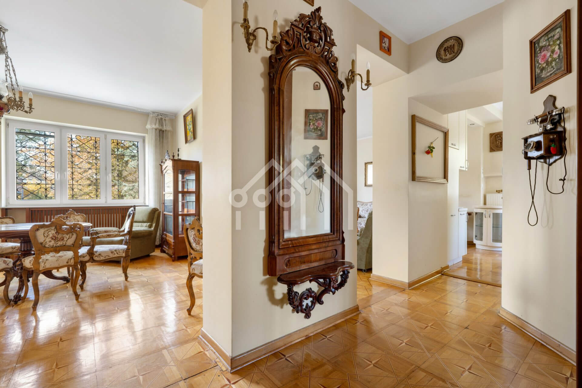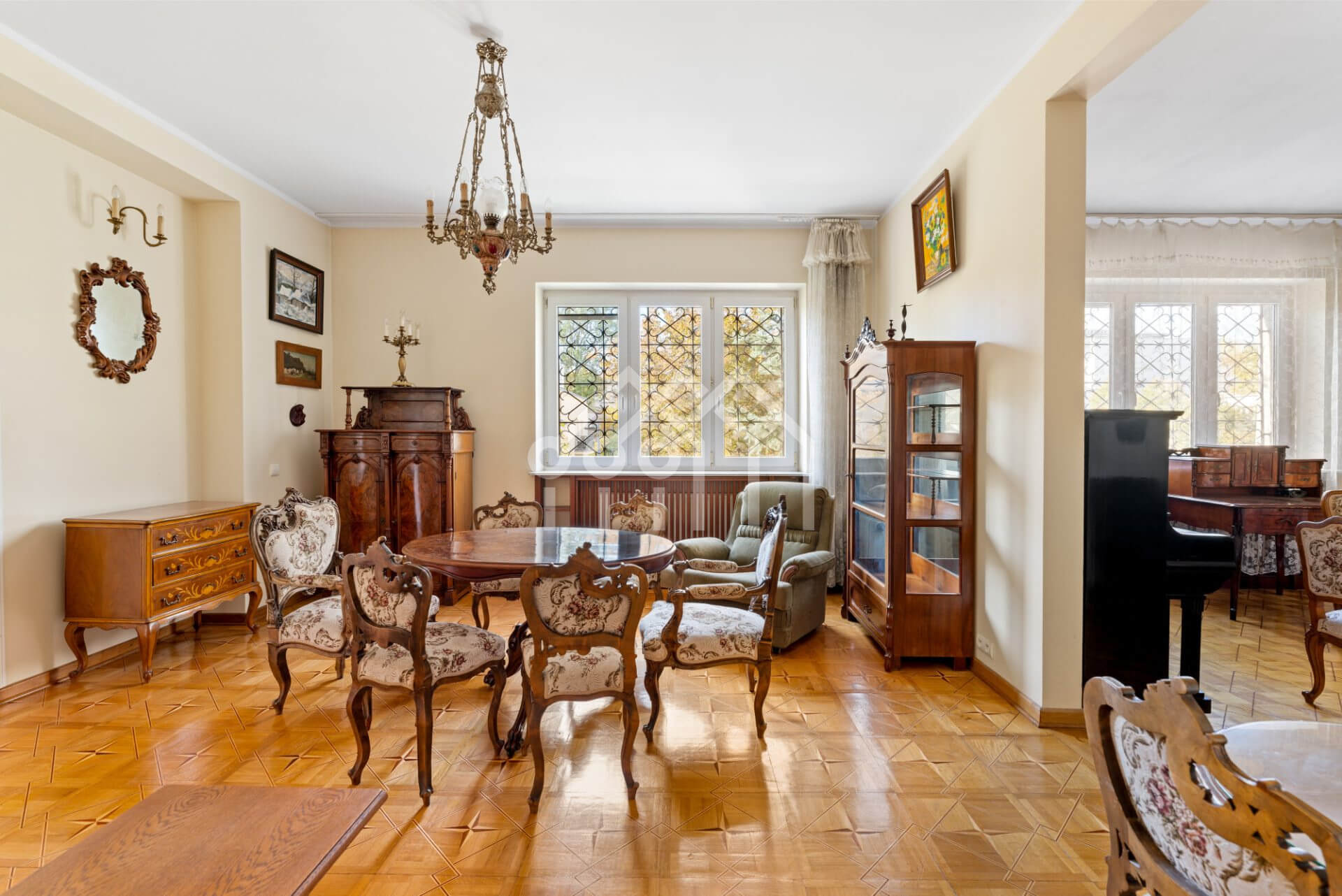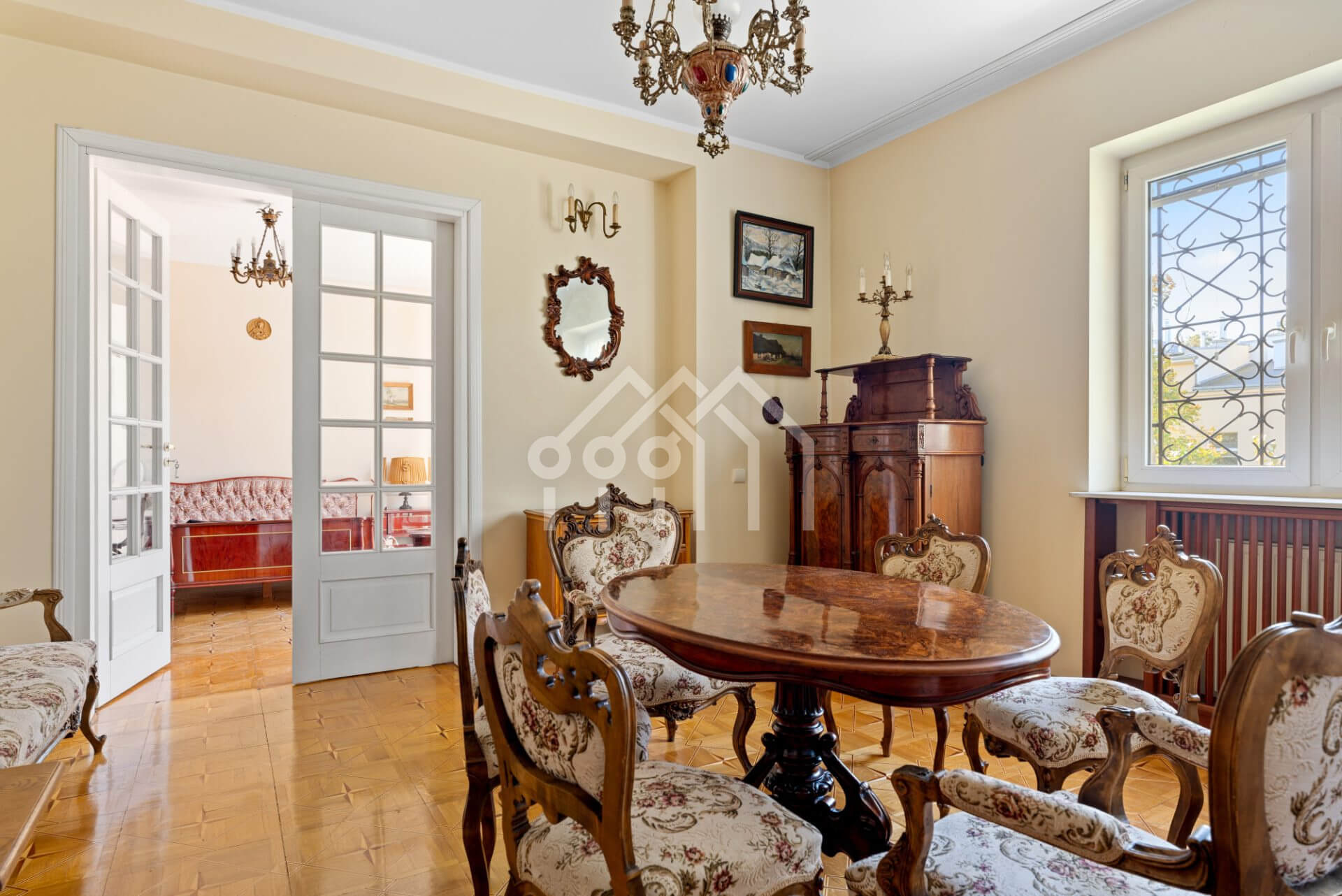 Wnętrza w stylu klasycznej elegancji — drewniane podłogi, oryginalne detale stolarki, wysokie sufity i duże okna PCV, które wypełniają przestrzeń naturalnym światłem.