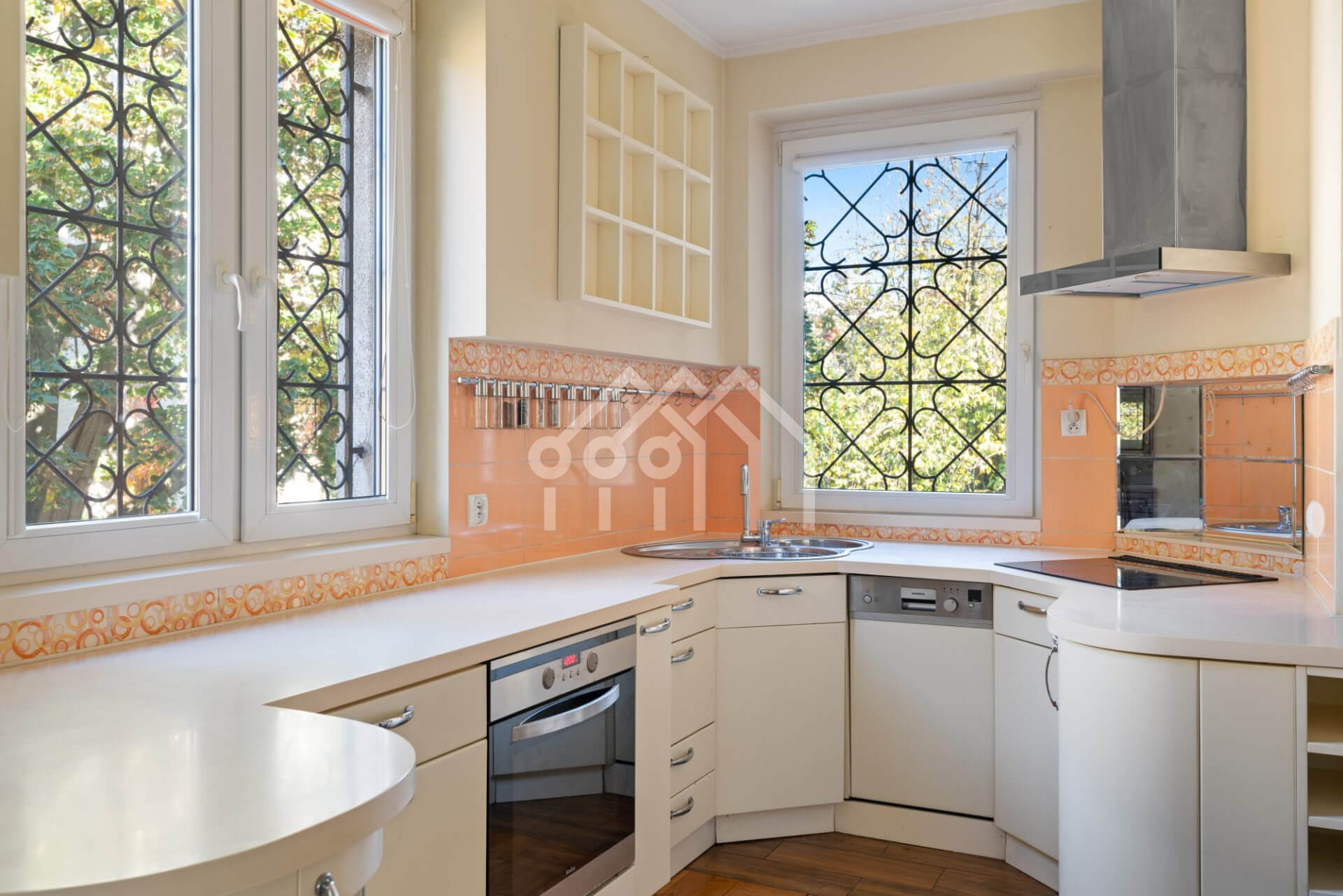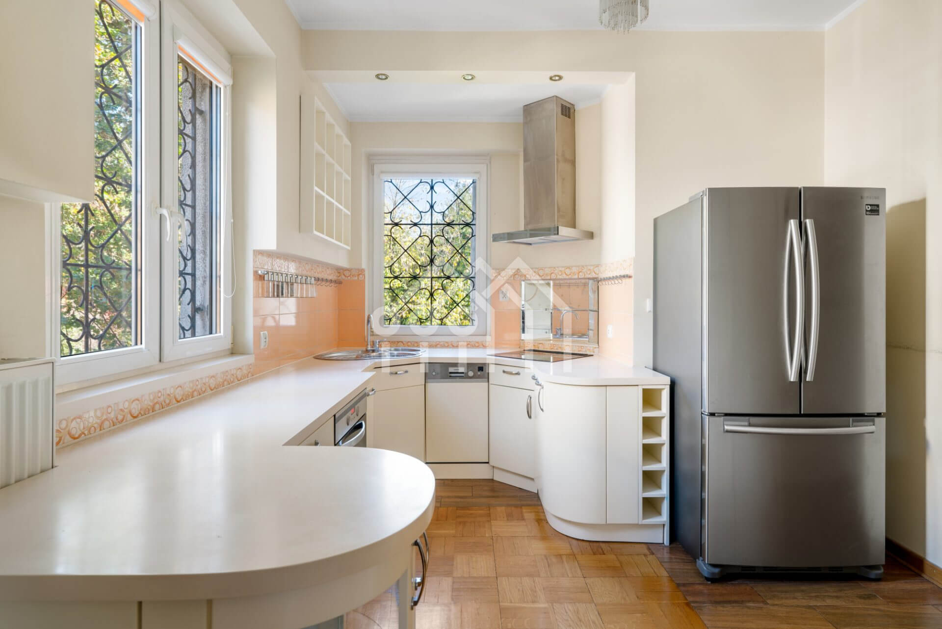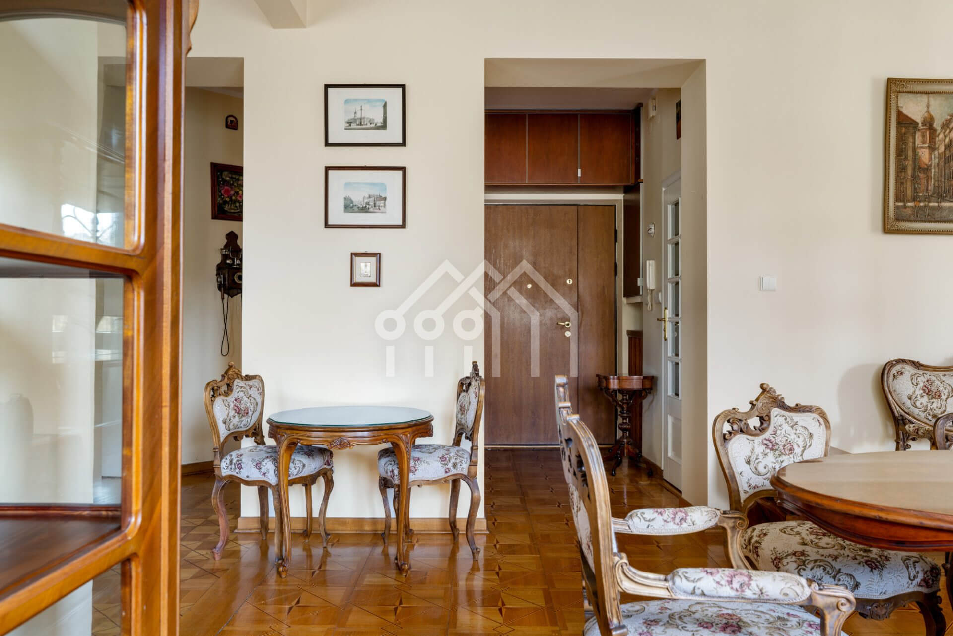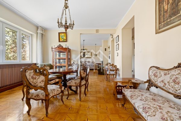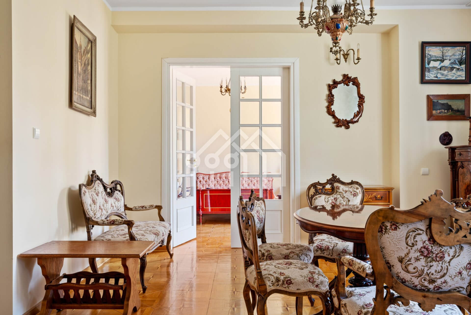 Wnętrza w stylu klasycznej elegancji — drewniane podłogi, oryginalne detale stolarki, wysokie sufity i duże okna PCV, które wypełniają przestrzeń naturalnym światłem.