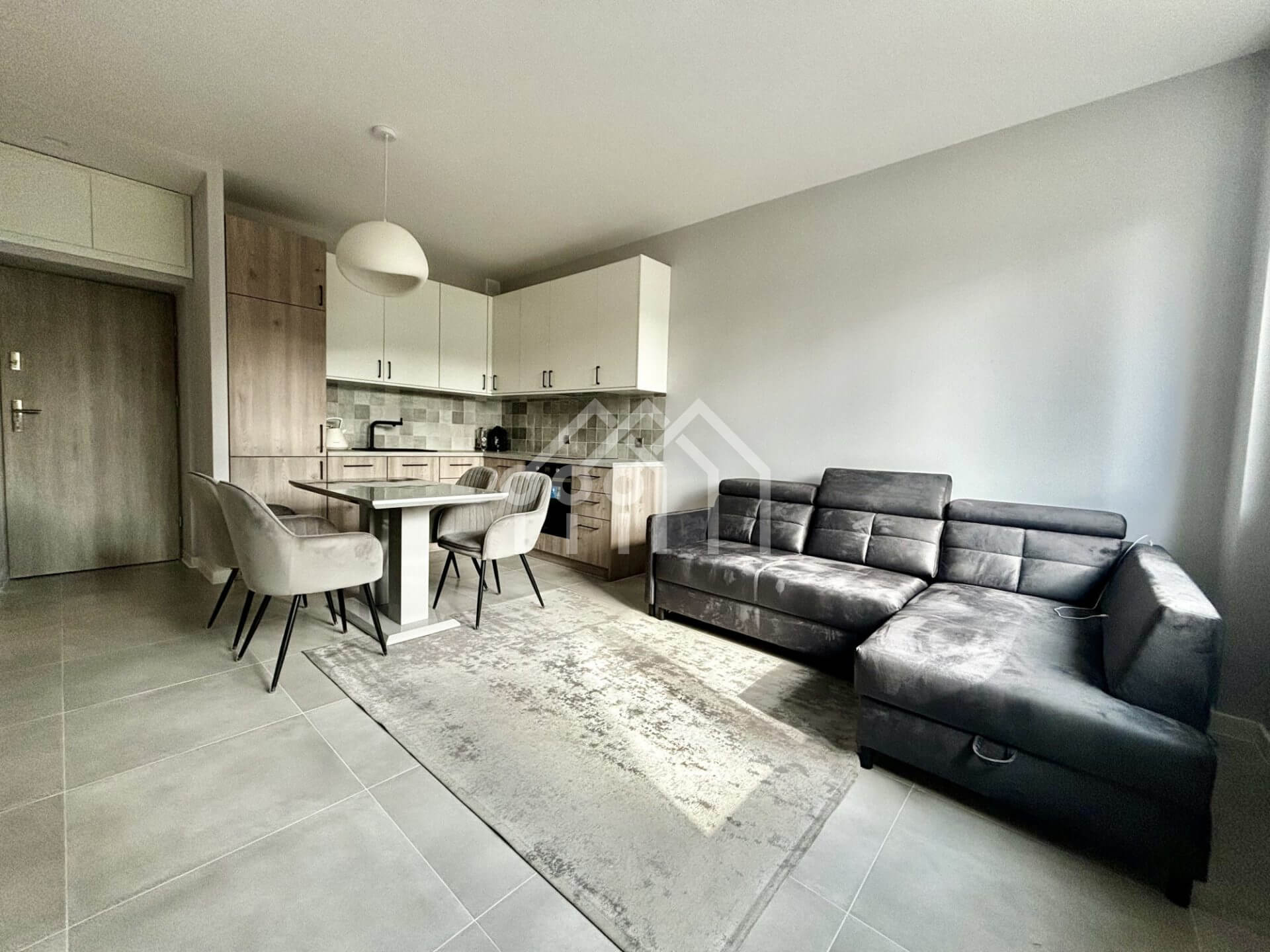-Salon wraz z aneksem kuchennym wyposażonym w płytę indukcyjną, okap, piekarnik, lodówkę oraz zmywarkę.