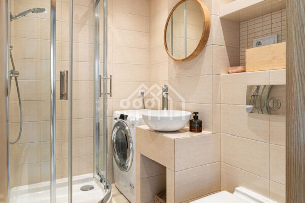 - Łazienka z jasnym wnętrzem wyposażona w kabinę prysznicową oraz pralkę,