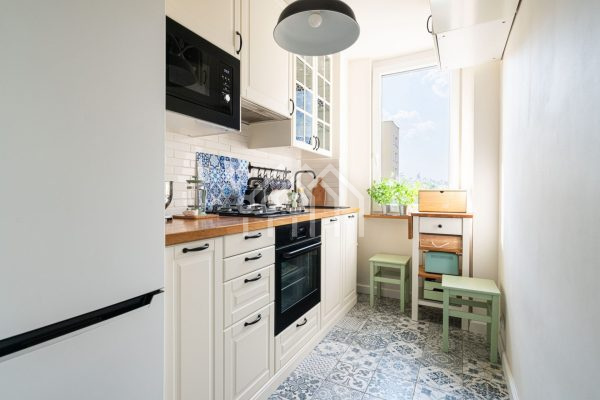 Na podłogach w salonie i sypialni znajduje się drewniana deska barlinecka, odporna na zarysowania. Jasna kuchnia, z praktycznymi w utrzymaniu płytkami, została wyposażona w nowoczesną zabudowę AGD (piekarnik, płyta gazowa, mikrofalówka). W całym mieszkaniu wymieniono okna na plastikowe, a w kuchni i salonie zainstalowano drewniane parapety.
