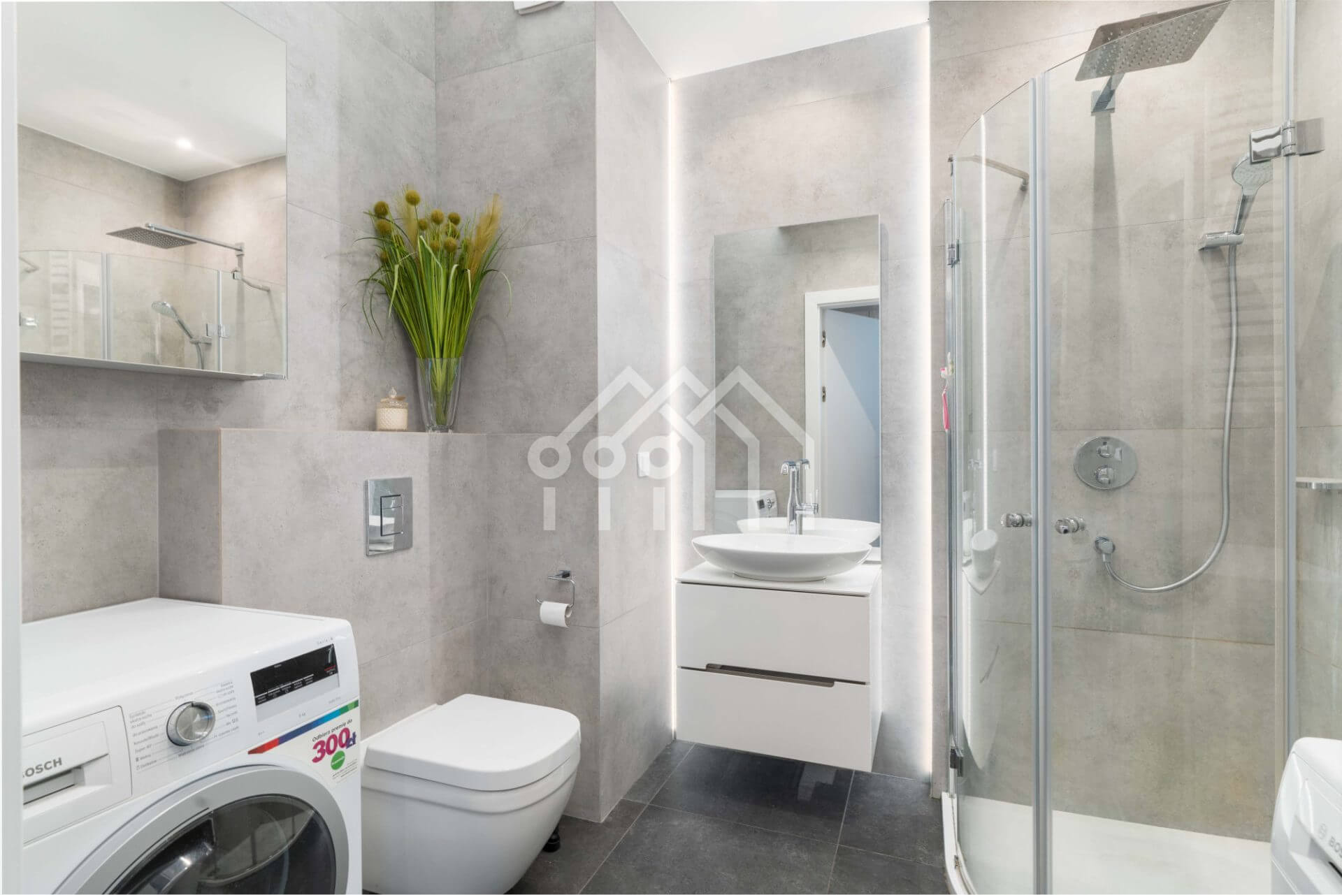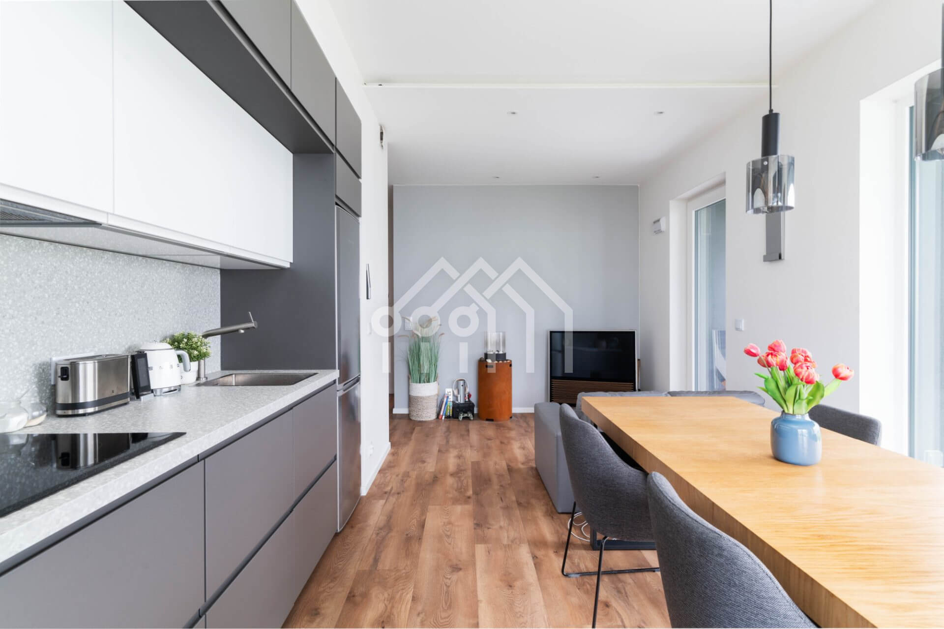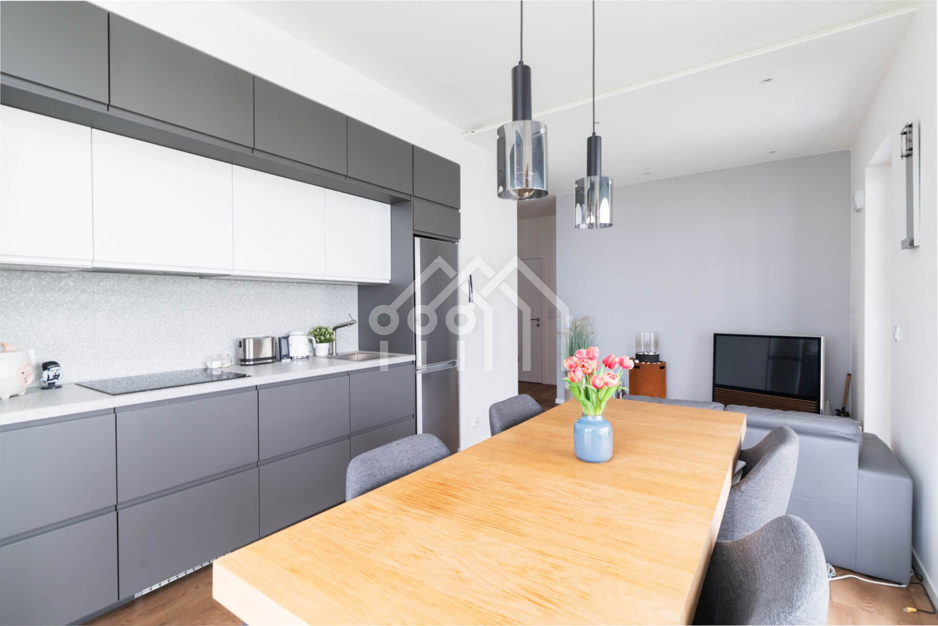 Nieruchomość ta jest w pełni umeblowana i wyposażona w wysokiej klasy sprzęt AGD. Kuchnia jest wyposażona w lodówkę, zmywarkę , piekarnik, płytę indukcyjną, mikrofalówkę, oraz filtr do wody.