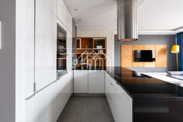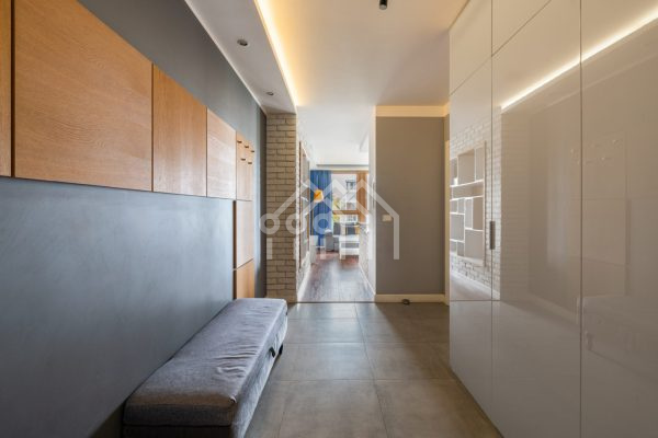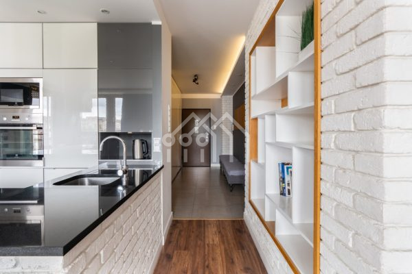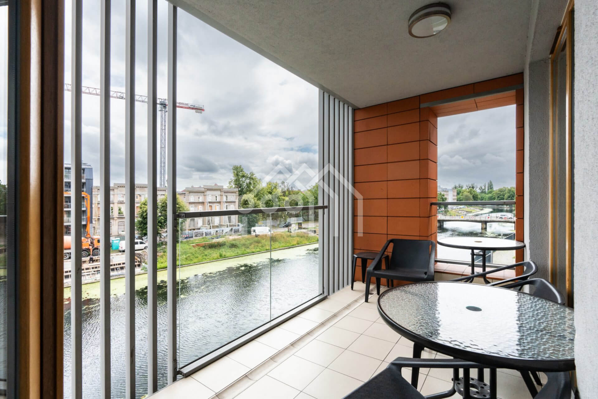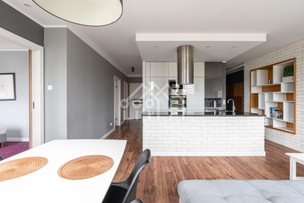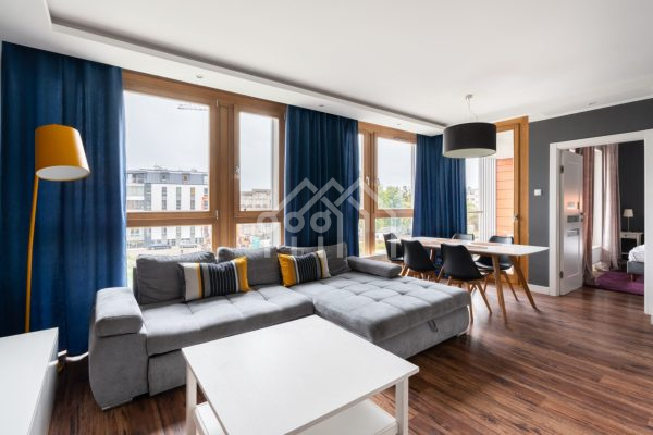 Przestronny salon z przeszkleniami na całej ścianie i wyjściem na balkon daje ogromną ilość naturalnego światła oraz widok bezpośrednio na rzekę. Na podłodze w mieszkaniu położone zostały wysokiej jakości panele oraz gres szkliwiony.