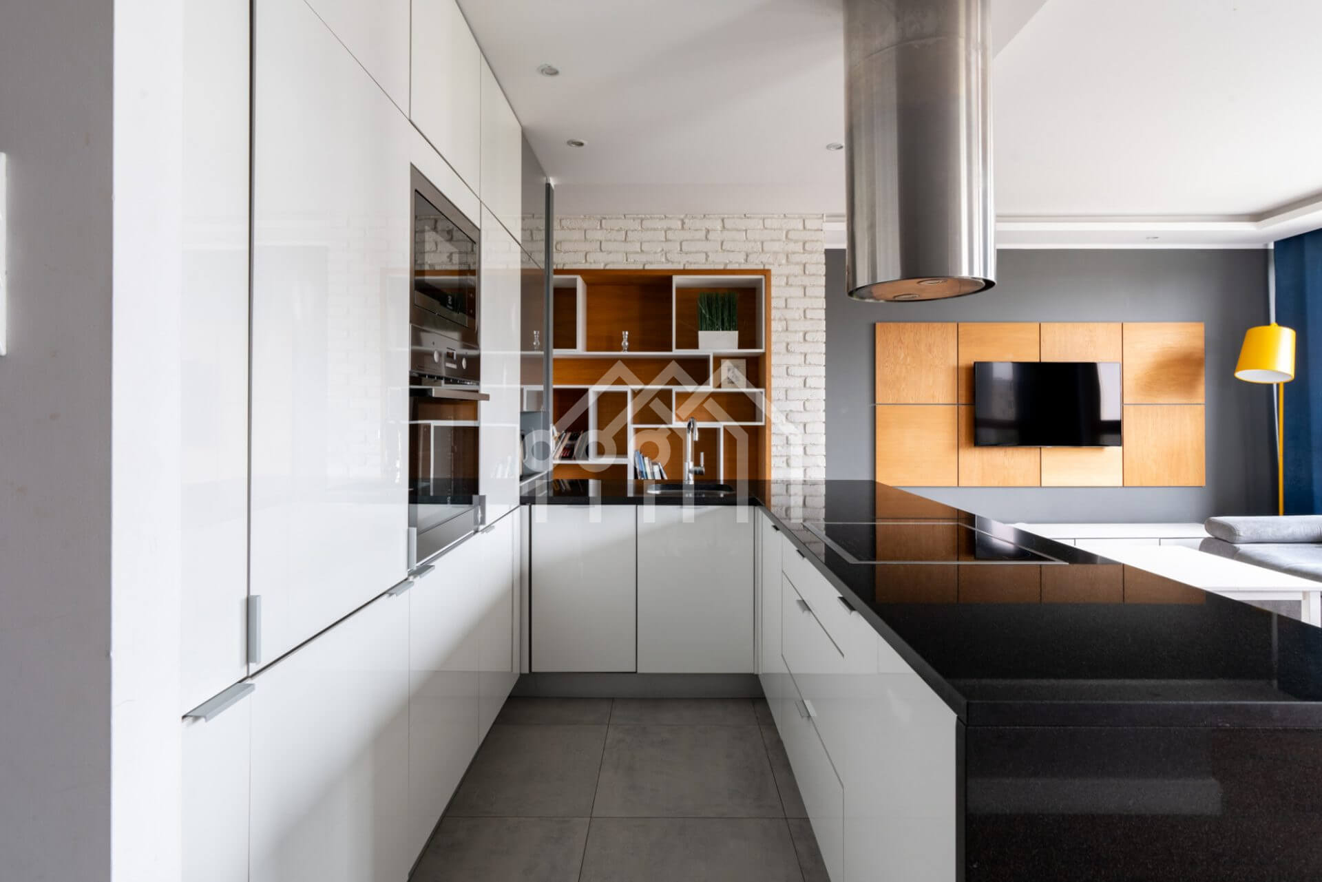Kuchnia w pełnej zabudowie, wyposażona w dużą wyspę, kamienne blaty i wysokiej jakości sprzęty.