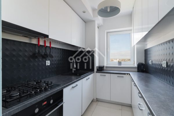 Na podłogach w salonie i sypialni znajdują się panele odporne na zarysowania. Jasna kuchnia, z praktycznymi w utrzymaniu płytkami, została wyposażona w nowoczesną zabudowę AGD (piekarnik, płyta gazowa). W całym mieszkaniu wymieniono okna na plastikowe.