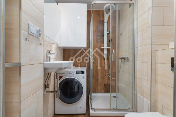 - Łazienka z jasnym wnętrzem wyposażona w kabinę prysznicową oraz pralkę
